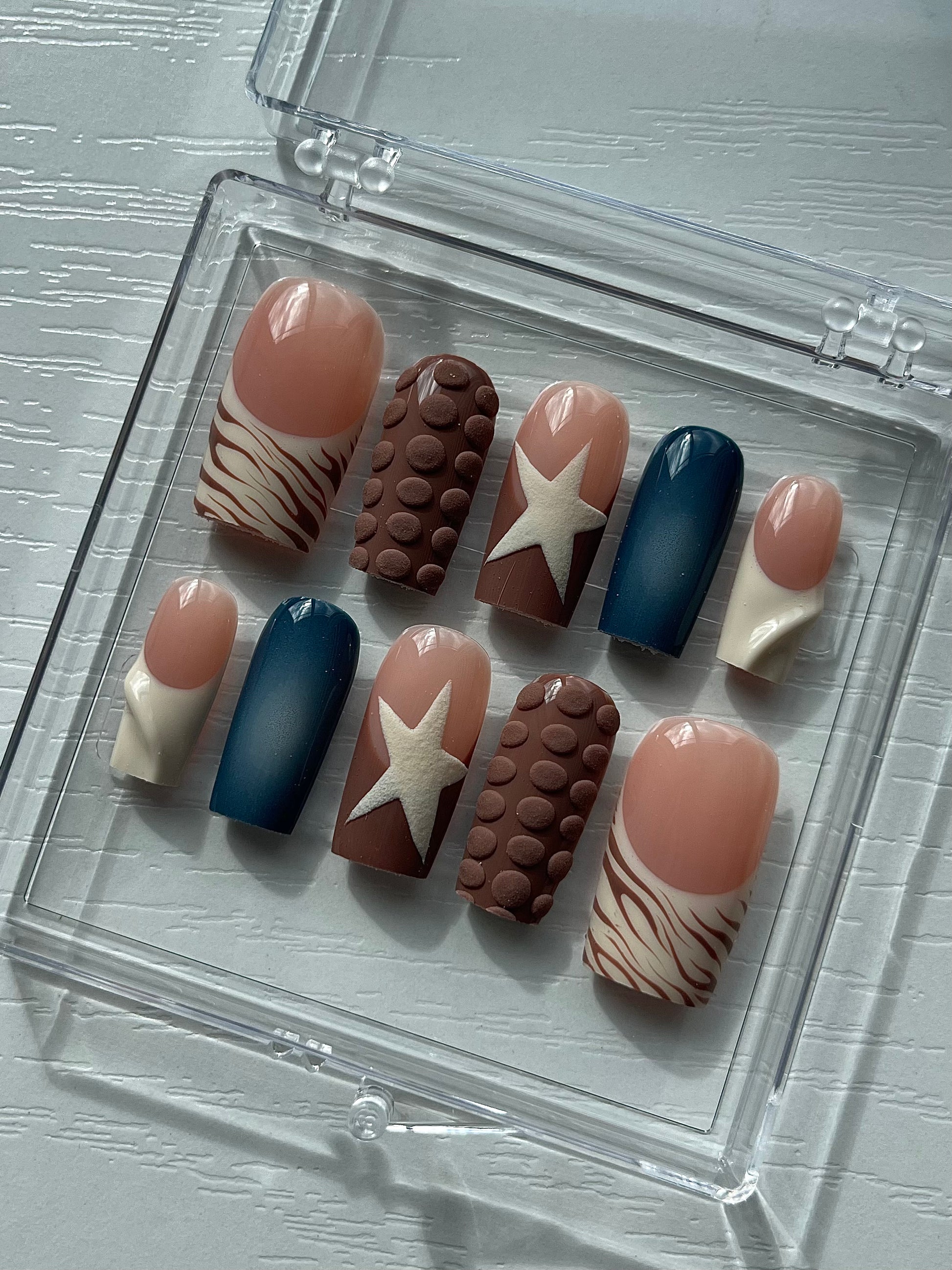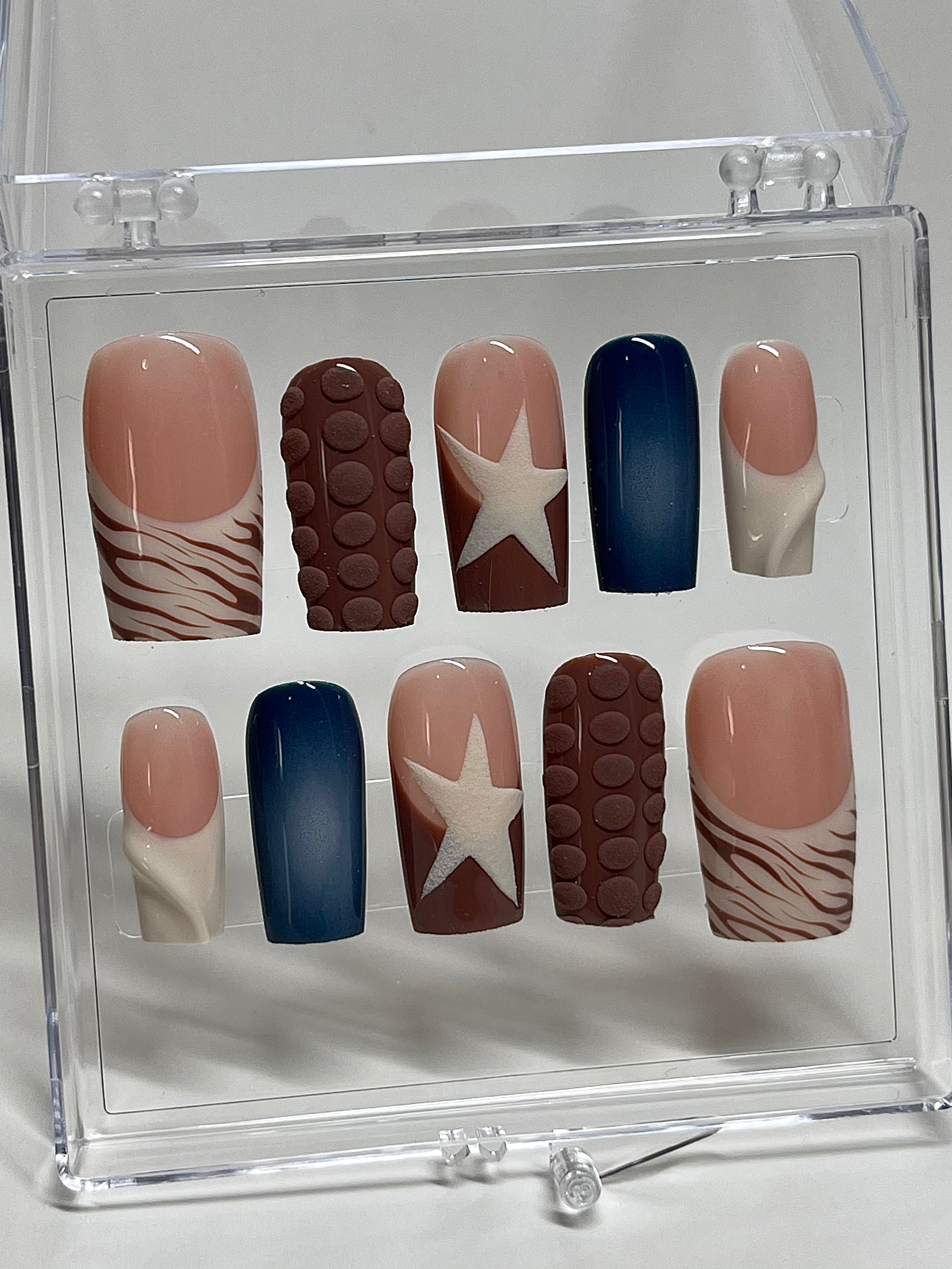 comes with acrylic box, nail prep kit , cuticle oil wipe , sticker & glue.