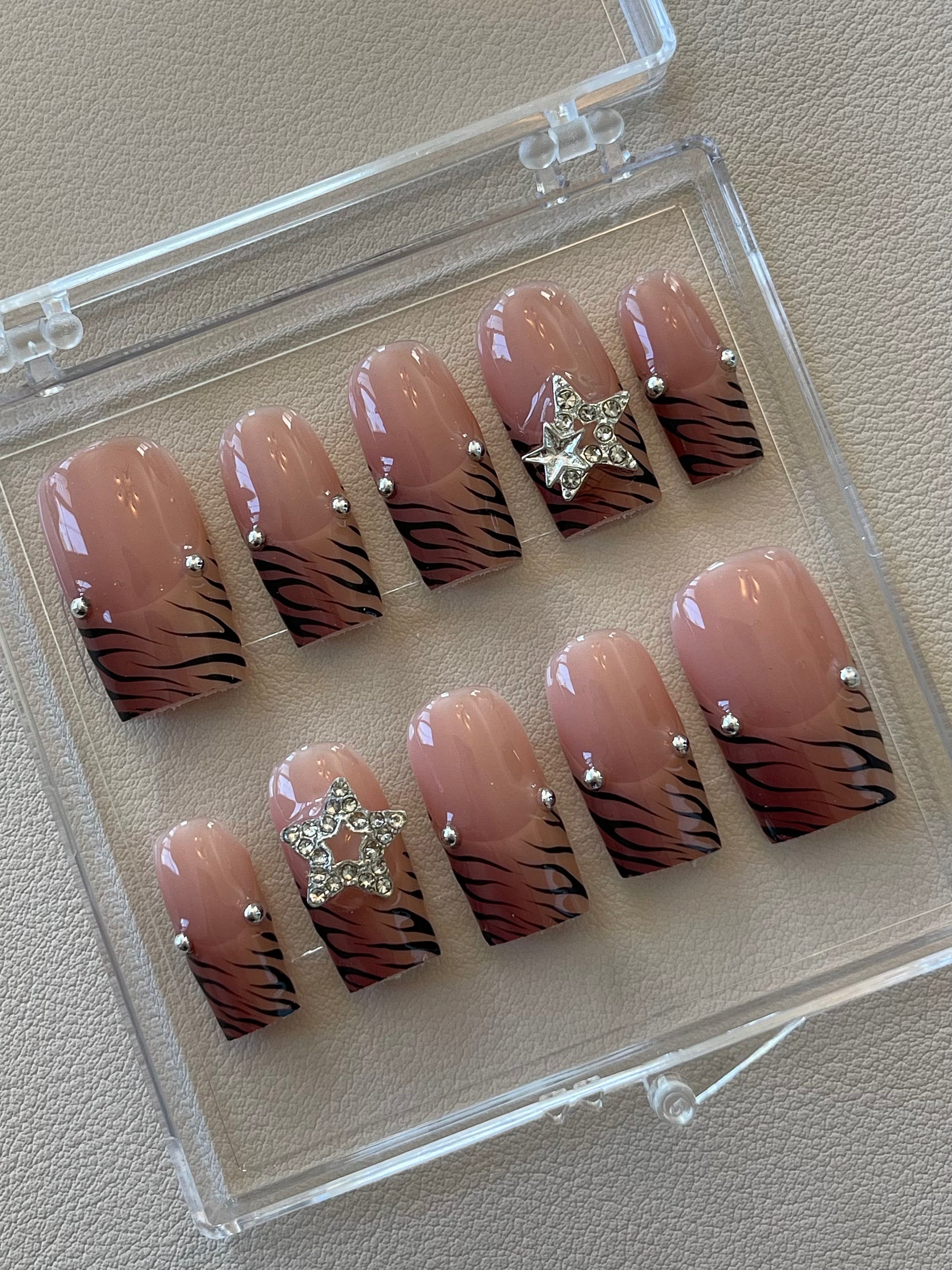 comes with acrylic box, nail prep kit , cuticle oil wipe , sticker & glue.