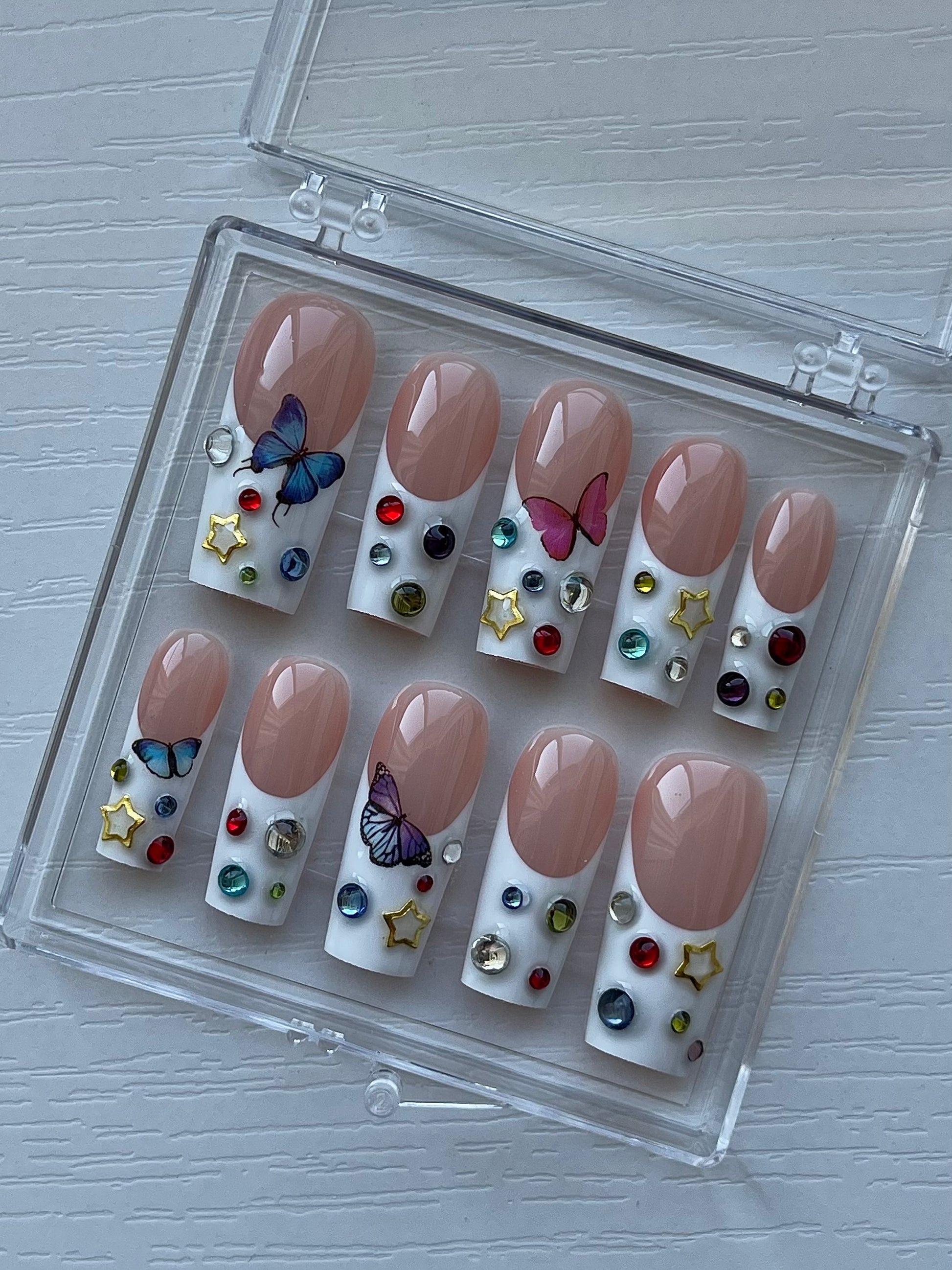 comes with acrylic box, nail prep kit & glue.