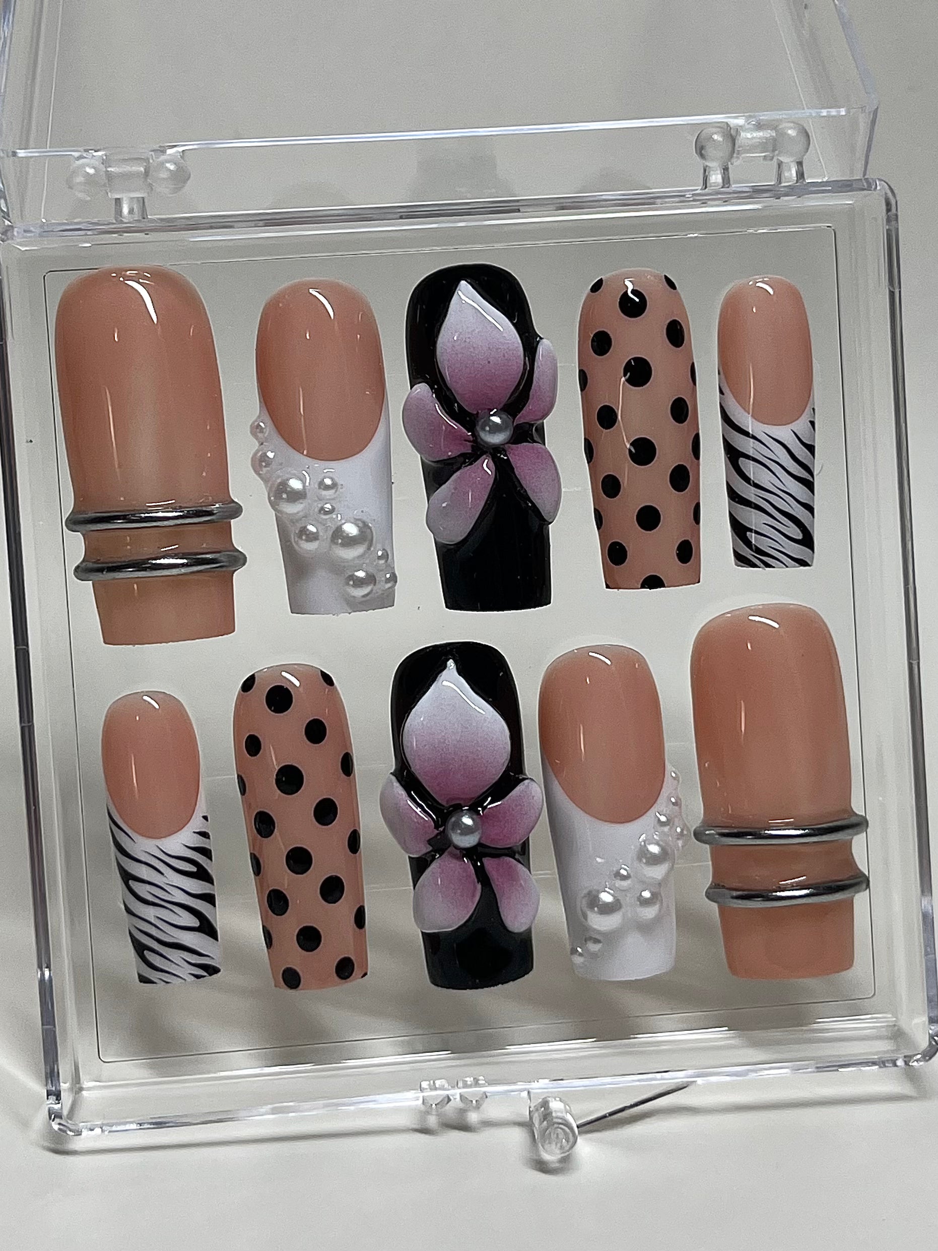 comes with acrylic box, nail prep kit , cuticle oil wipe , sticker & glue.